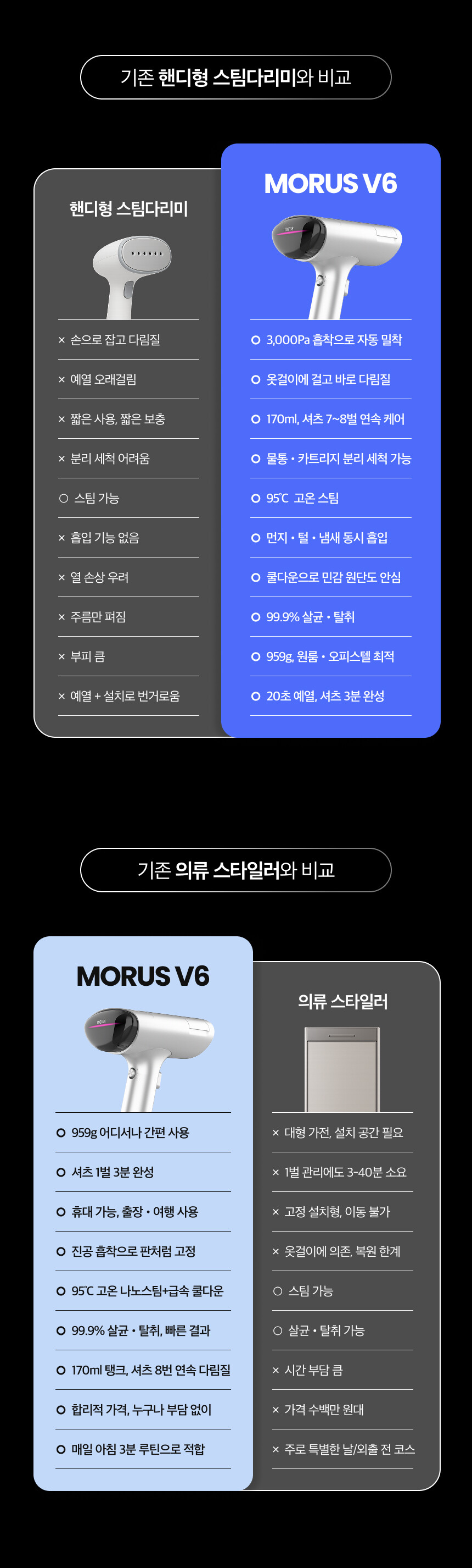 MORUS 모러스 V6 나노스팀 진공흡입 핸디스타일러 스팀다리미 의류스티머